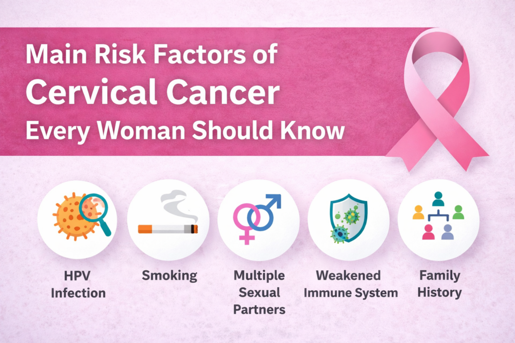 Cervical cancer mainly cervix ane part lo develop avutundi. Idi uterus ki kindha unna narrow part. Ee area chala sensitive kabatti, small negligence kuda long term lo big problem ga marochu. Lifestyle, sexual habits, infections, health conditions anni kalisi risk factors of cervical cancer ni gradual ga increase chestayi.